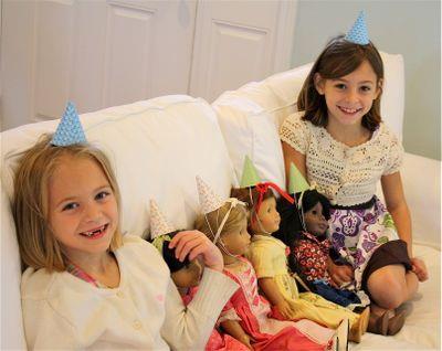 The party hats are from Martha Stewart, but you could also easily make your own, using scrapbook paper to roll out into a cone, hot-gluing into place, and then attaching elastic.