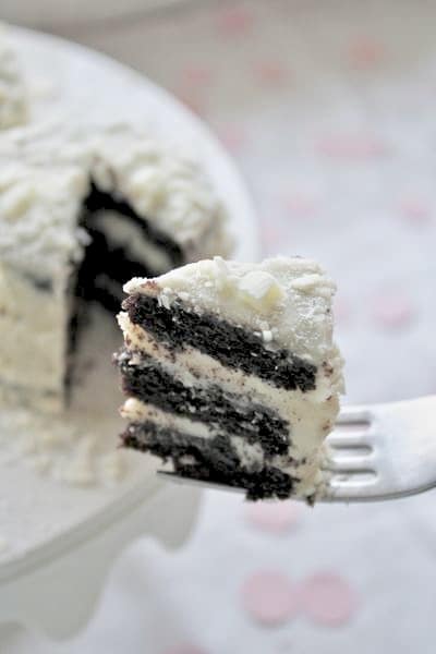 The tiny three-layer cakes were made by baking chocolate cake in a sheet pan and cutting out the layers with a small circular cookie cutter. I frosted each tiny cake just as I would with a regular-sized cake, and covered each one with white chocolate shavings.