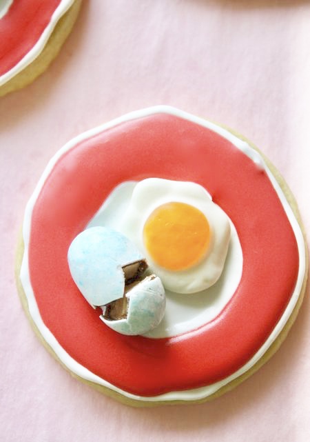 Decorate the cookies: Flood with frosting as shown with the cookies in my Christmas Wreath project, using the same icing recipe. Outline and flood the rim of the cookie plate with icing and then flood the center. Allow to set and top with a gummy fried egg and cracked candy egg. (See sources below).