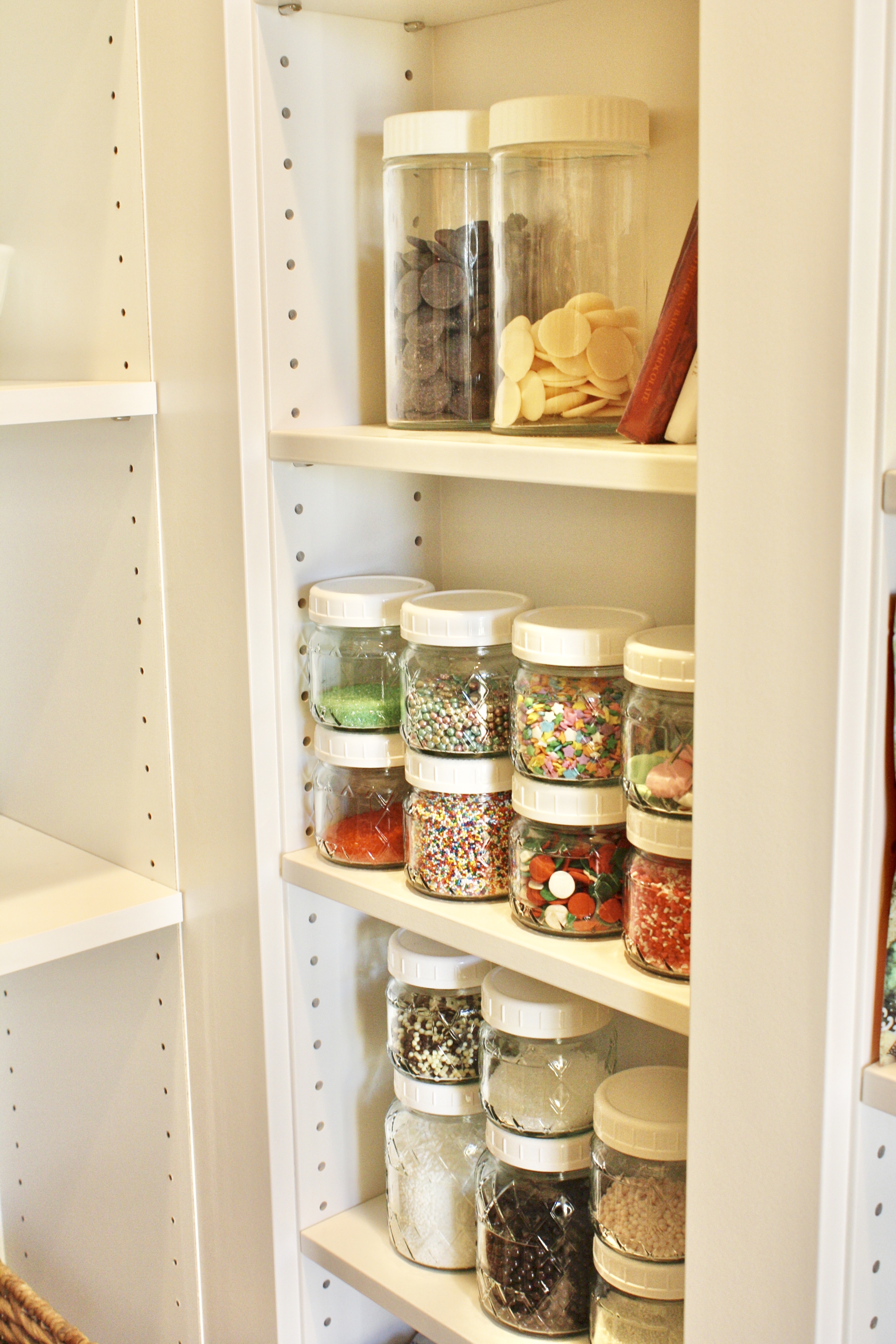 When we were working with Nancy on the floor plan, the pantry started out quite large, which in my opinion, can’t ever be big enough. (I store all our food in the pantry). Growing up, no matter how small our living space, my mom always had a larder and I really loved those spaces with our home-canned goods and bulk foods all in jars, glistening on the shelves my dad had built by hand. In the design of this home, the pantry was continually downsized to make room for other areas, such as the built-in buffet in the dining room, which sits on the other side of the pantry wall. So, I had to get creative with making more out of the space than was originally intended.