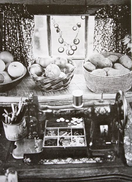 My affinity for calico was born with the curtains seen here. My mom’s necklace doubles as a work of art in the window. A found tobacco tin holds pens. The treadle sewing machine I learned to sew on. ~Serena