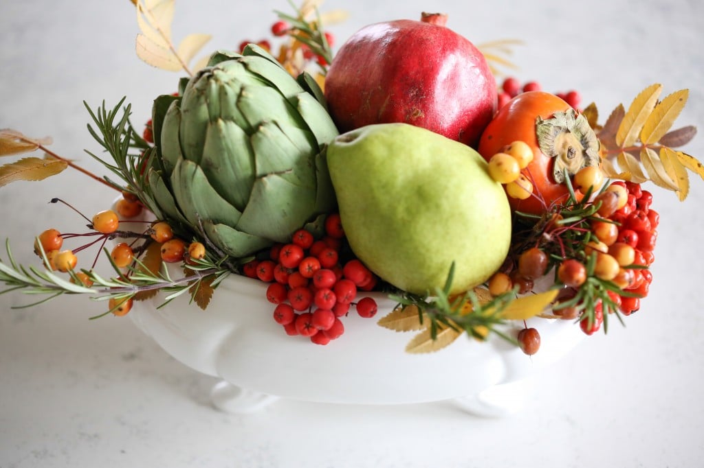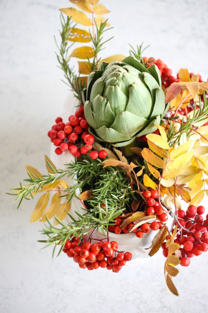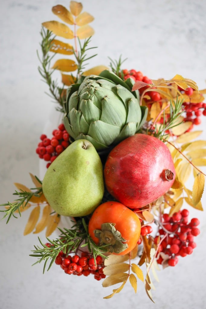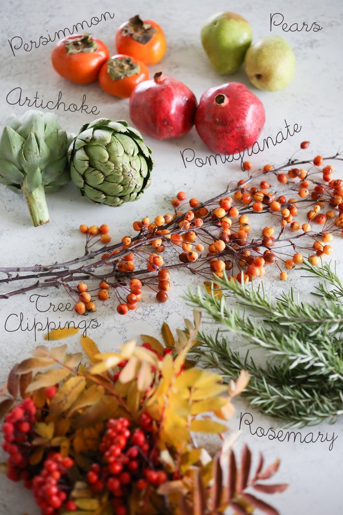 I like to start with any items I can forage like clippings from my neighbor’s trees and rosemary from my garden and then fill in with other pretty elements that are fitting for the season. In this case, it’s my interpretation of a Cornucopia, so I picked up some persimmon, pears, pomegranate and artichokes from the supermarket.