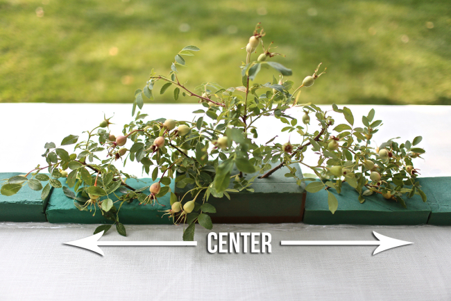 As you can see in the picture above, I pushed in the Saran Wrap to just wide enough to protect the foam and make it so it couldn’t be seen. You’ll notice I left one of the blocks its original size to mark the true center of the runner. That way I could create a center focal point and also have a clear visual as I’m building it out beginning with the center point foliage angling straight up, everything to the left of center leaning left, and everything right of center leaning right. Although the arrangement is a bit wild or earthy in nature, to keep the overall look well thought out, there needs to be order. The center, left, right system does that.