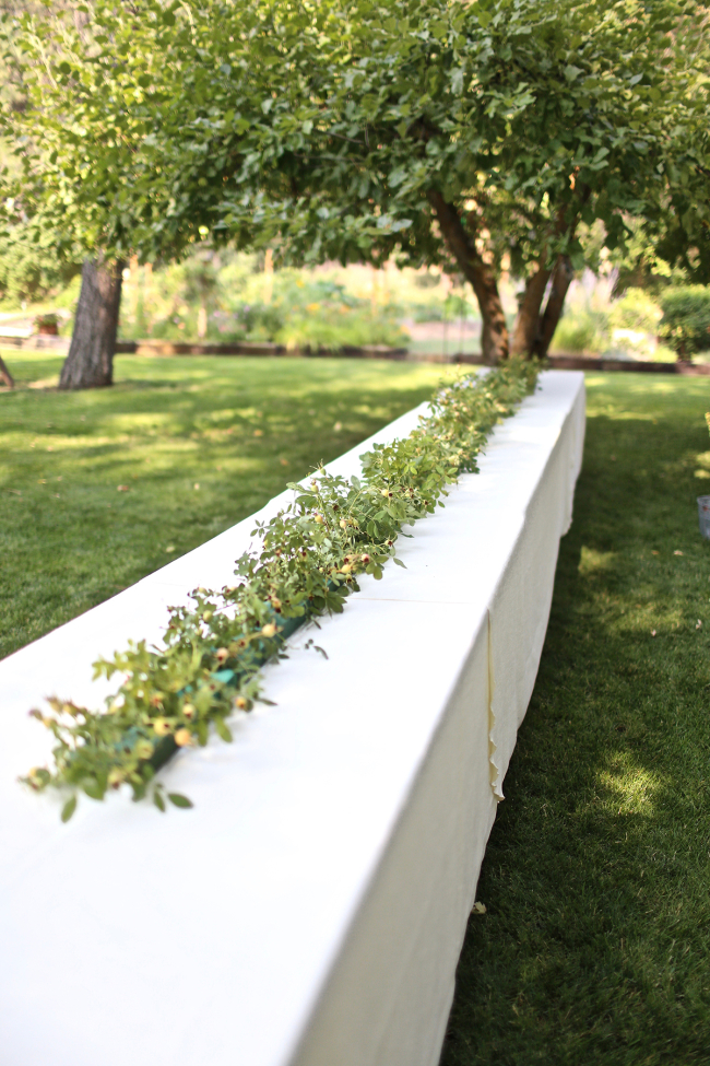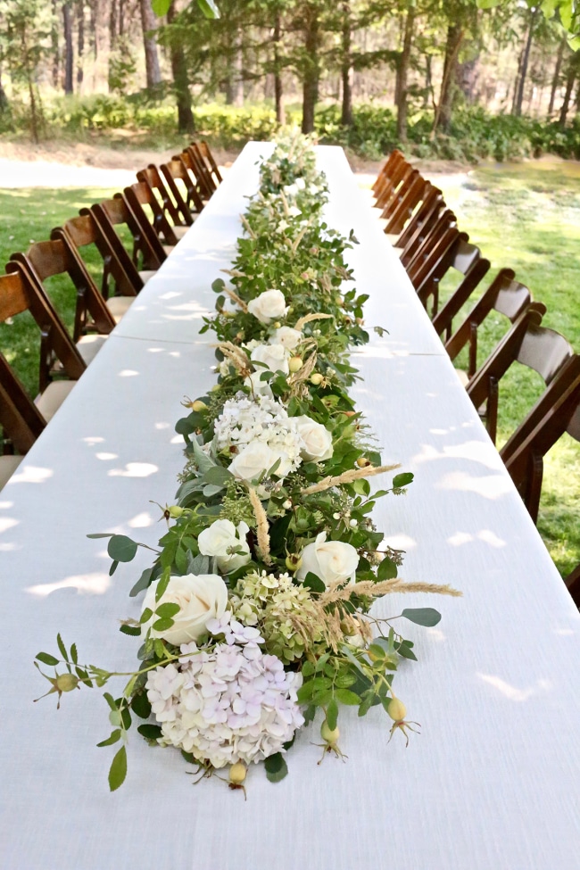To give the runner an extra special touch and to save money on the cost, I foraged for Rosehips, Snowberries, and Wild Grass from the roadside, and Sage and Hydrangea from my yard. I limited purchased add-ins to a variety of Eucalyptus from the store along with sixty white roses. (The Hydrangea blossoms are not seen in the picture below, because they were protected in a large kitchen garbage bag full of cold water. The flower petals on hydrangeas absorb water so it’s a nice way to keep the Hydrangea extra hydrated before placing).