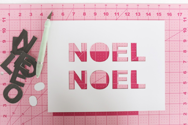Then cut out the letters with an X-acto knife, saving the center of the O’s and cutting those out next. (I use this handy Fiskar cutting mat from JoAnn‘s for all of the cutting).
