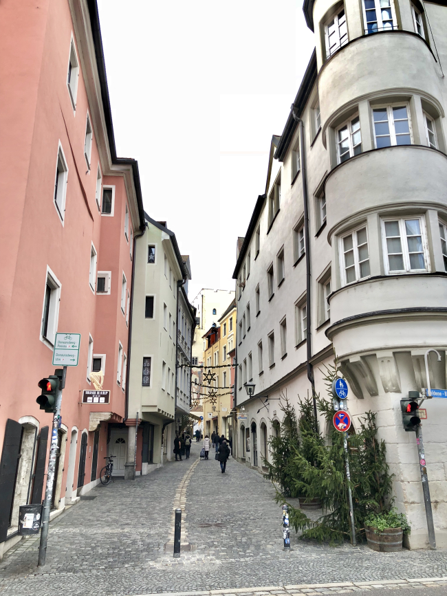 We had an early morning start in Regensburg, Germany, another stop on our tour of the wonderful Christmas Markets in Europe aboard a Viking River Cruise. We thought we were bundled up enough, but oh my goodness it was definitely the coldest day of our trip. Our goal was to just keep moving as much as possible to try and stay somewhat warm. We were headed to a Christmas market but couldn’t help but admire the festive windows, doors, and streets as we went along.