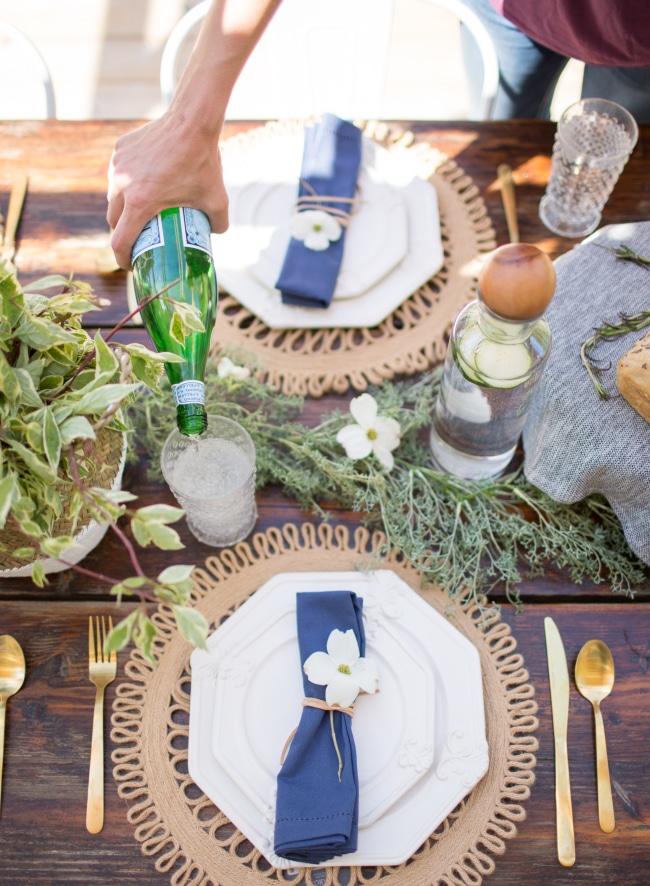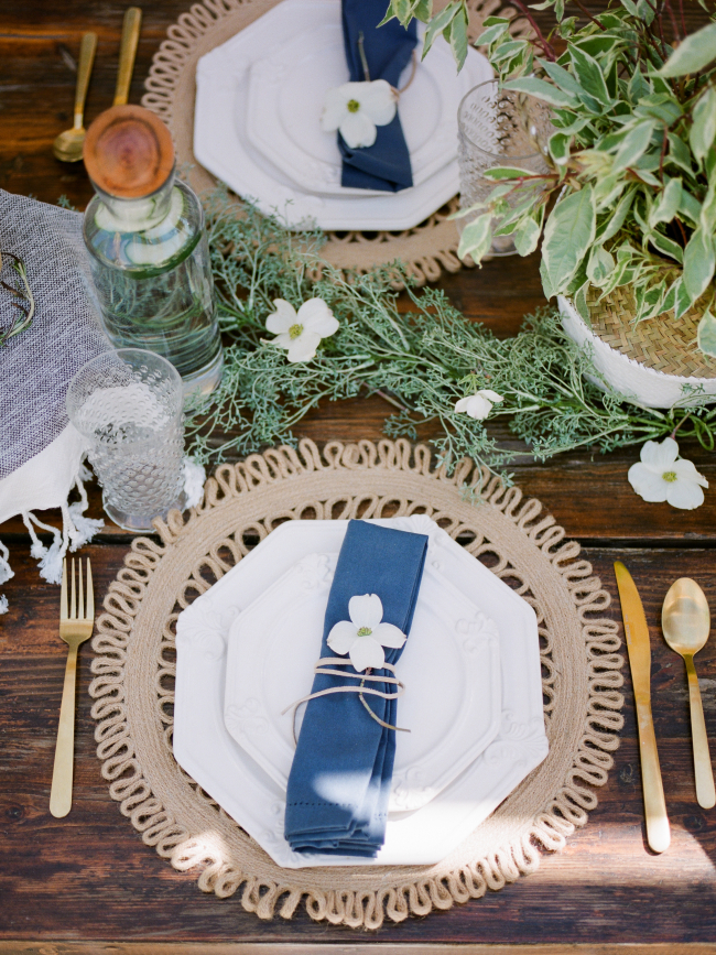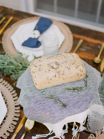 Oftentimes, a tabletop can come up a little short if the table is too bare, but filling a table can be expensive. Shannon does a great job tackling both of these issues right out of the gate by simply using cuttings from her yard as a tablerunner and houseplants as decorative tabletop filler. Cakestands make handy display pieces for simple, yet elegant loaves of bread which double as a part of the meal, and as decorative items too.