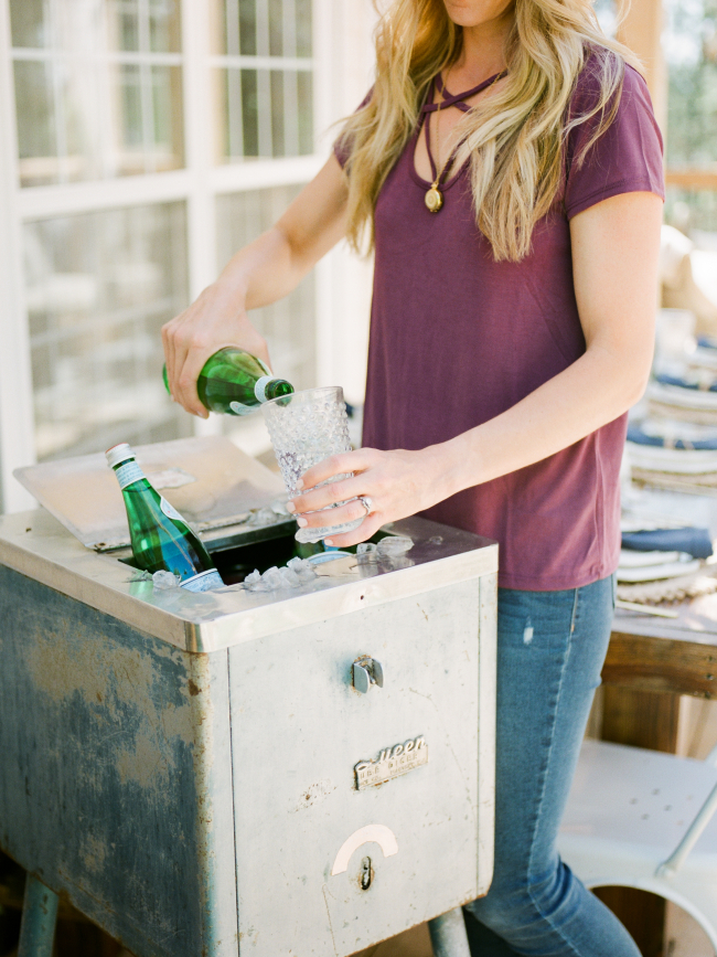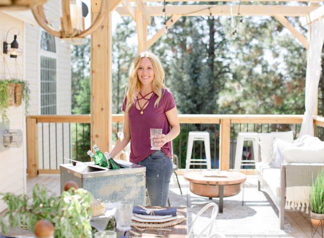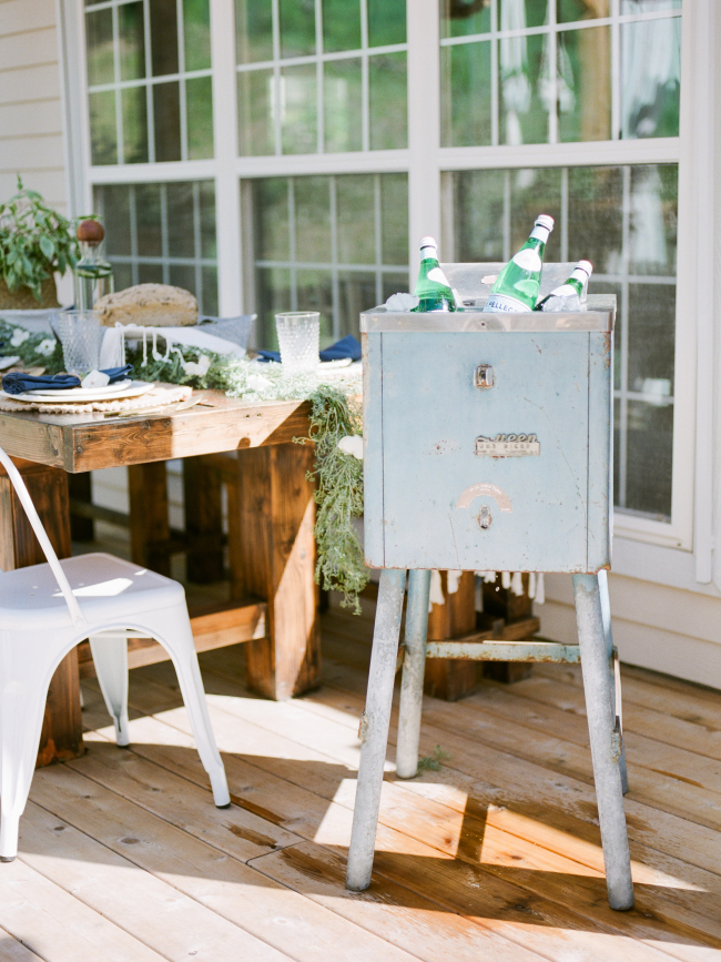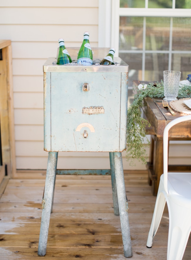 Last summer, Shannon’s husband ripped down their deck and built a much larger one. But with all of the new deck space, they were faced with the challenge of finding the right pieces of furniture to fill it. Shannon started by pulling a table from their fire pit area which created the perfect outdoor eating space and began filling in from there. They used the new space a lot but found themselves going in and out of the house quite a bit for cold drinks. Then one afternoon, she stumbled upon a vintage blue ice machine on their neighborhood garage sale website. It was perfect! The dimensions were just right, it gave the subtle splash of color she was looking for, and was only $30!