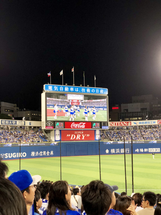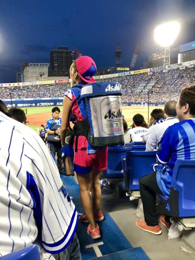 A real bonus with attending a Baystars game is that there are a ton of announcements in English, which I guess isn’t common, so we were really happy about that. Once you sit down in your seat, you can’t help but notice some big differences to an American baseball stadium. First of all, the seats are TINY. I’m a small person and I felt very squished. Everything is veryclean (as are the majority of the public spaces in Tokyo). Many of the fans have little garbage bags hung at their seats where they put every bit of their garbage. There is NO garbage tossed on the floor. None. In fact, someone near us spilled a beer and everyone took immediate notice. And just as quickly as the beer had been spilled, there was an employee there with a mop to thoroughly clean it up.