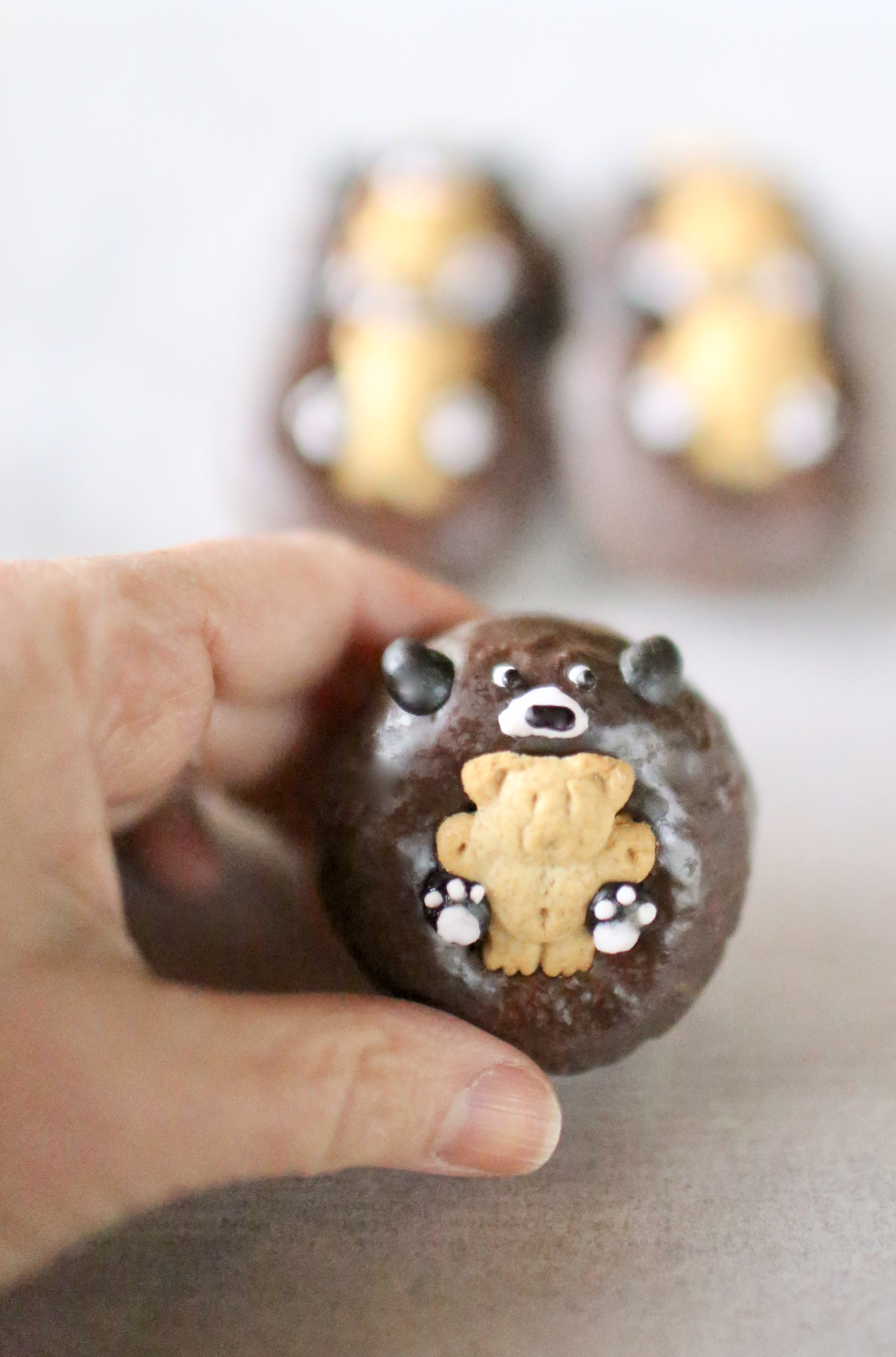 - Step 2: Using the dark brown icing with the #5 tip, pipe on little paws on either side of the teddy graham as seen in step 2. in the image below. If the icing has a pointy tip, dab your fingertip in a tiny bit of water and gently press down on the paw to smooth it out.
