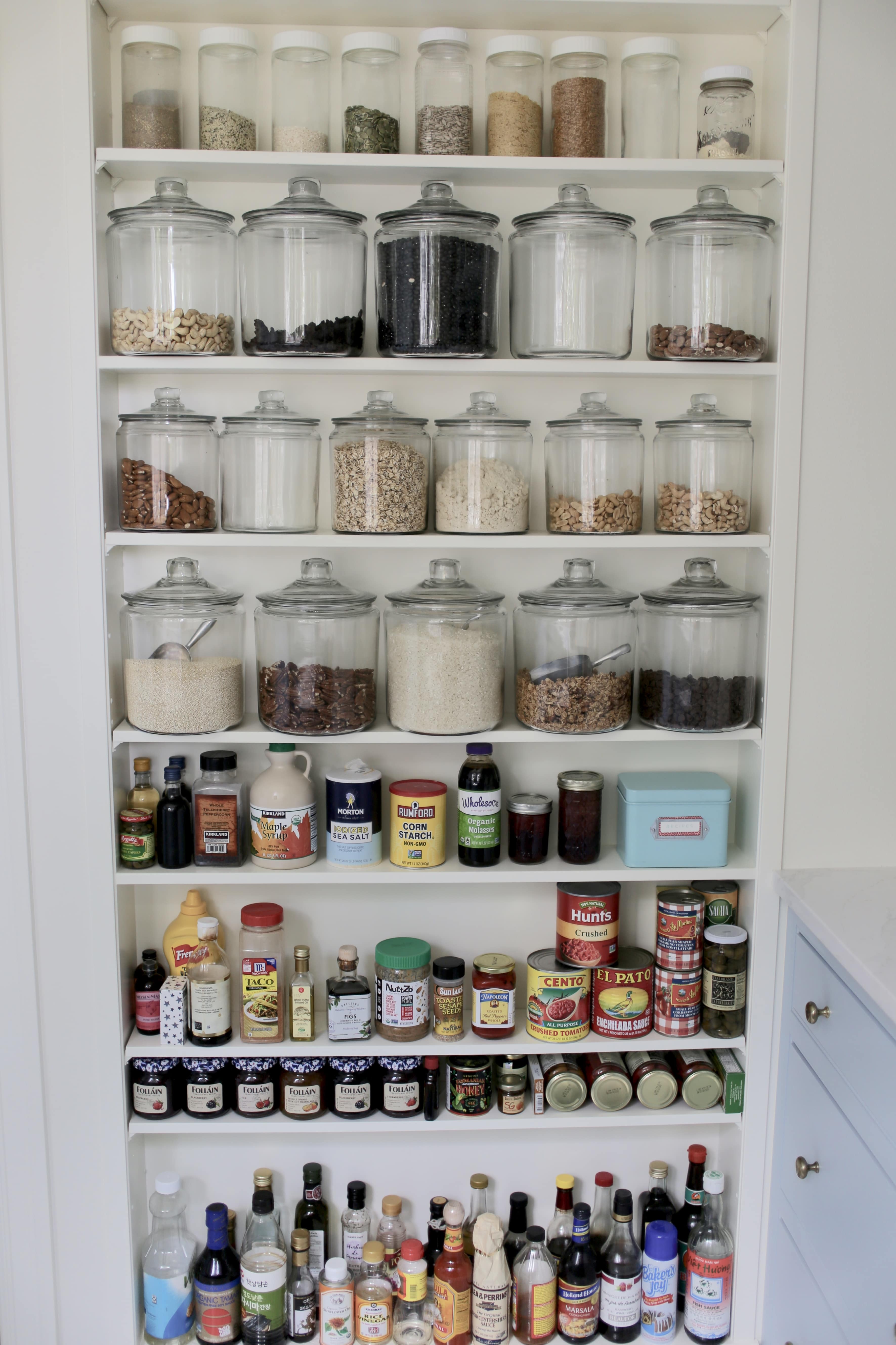 To make the most of the space, I had shelves built into the interior wall just deep enough to hold pantry jars, canned foods, and baking/cooking supplies. Because they’re inset, it still allows space for the drawers to open on the adjoining wall.