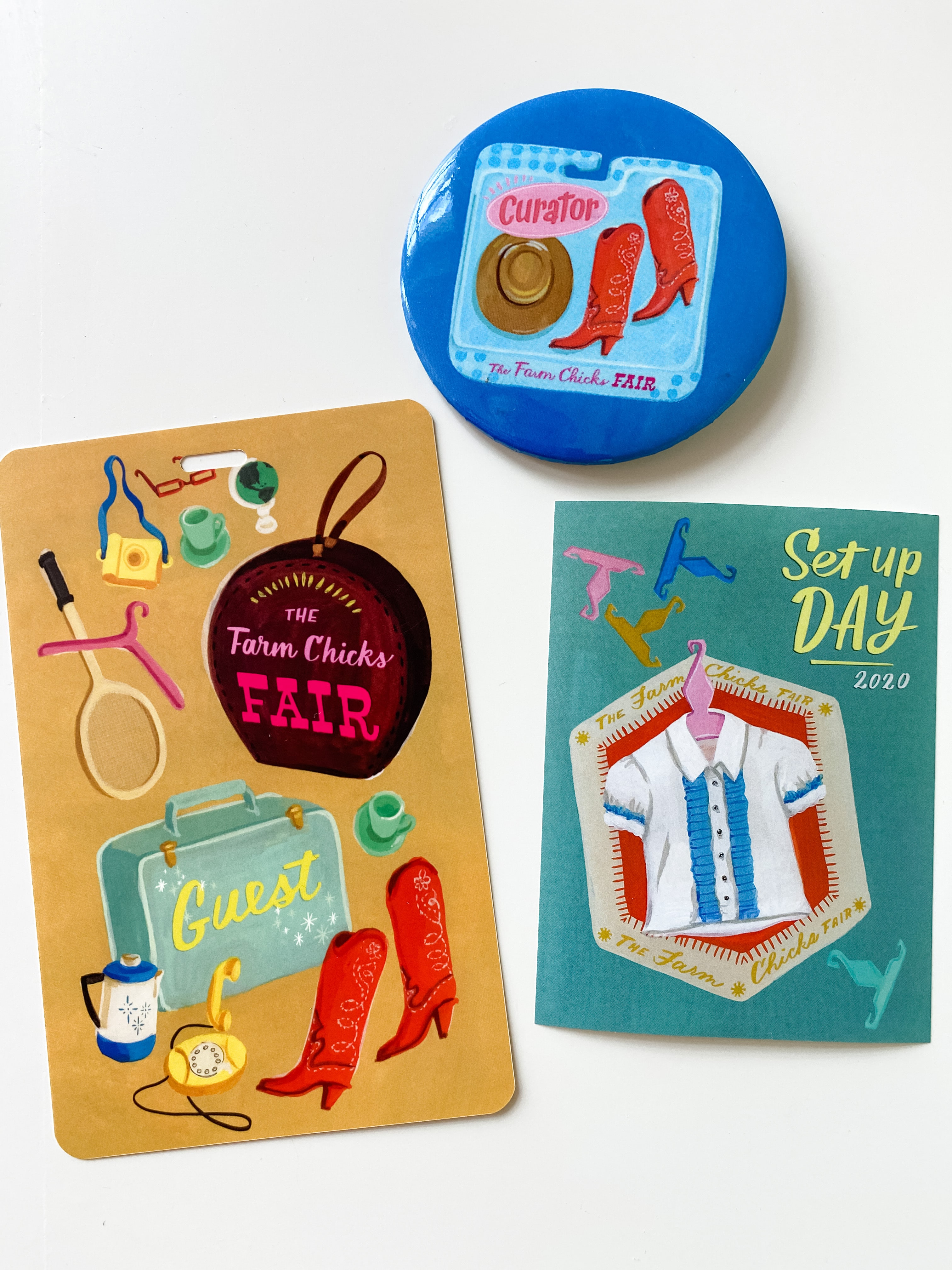 The guest badges featured Barbie-style accessories, the set-up day badge a simple Barbie-style little top on a hanger, and the Curator badge depicted a retail Barbie-style hat and boots toy package.