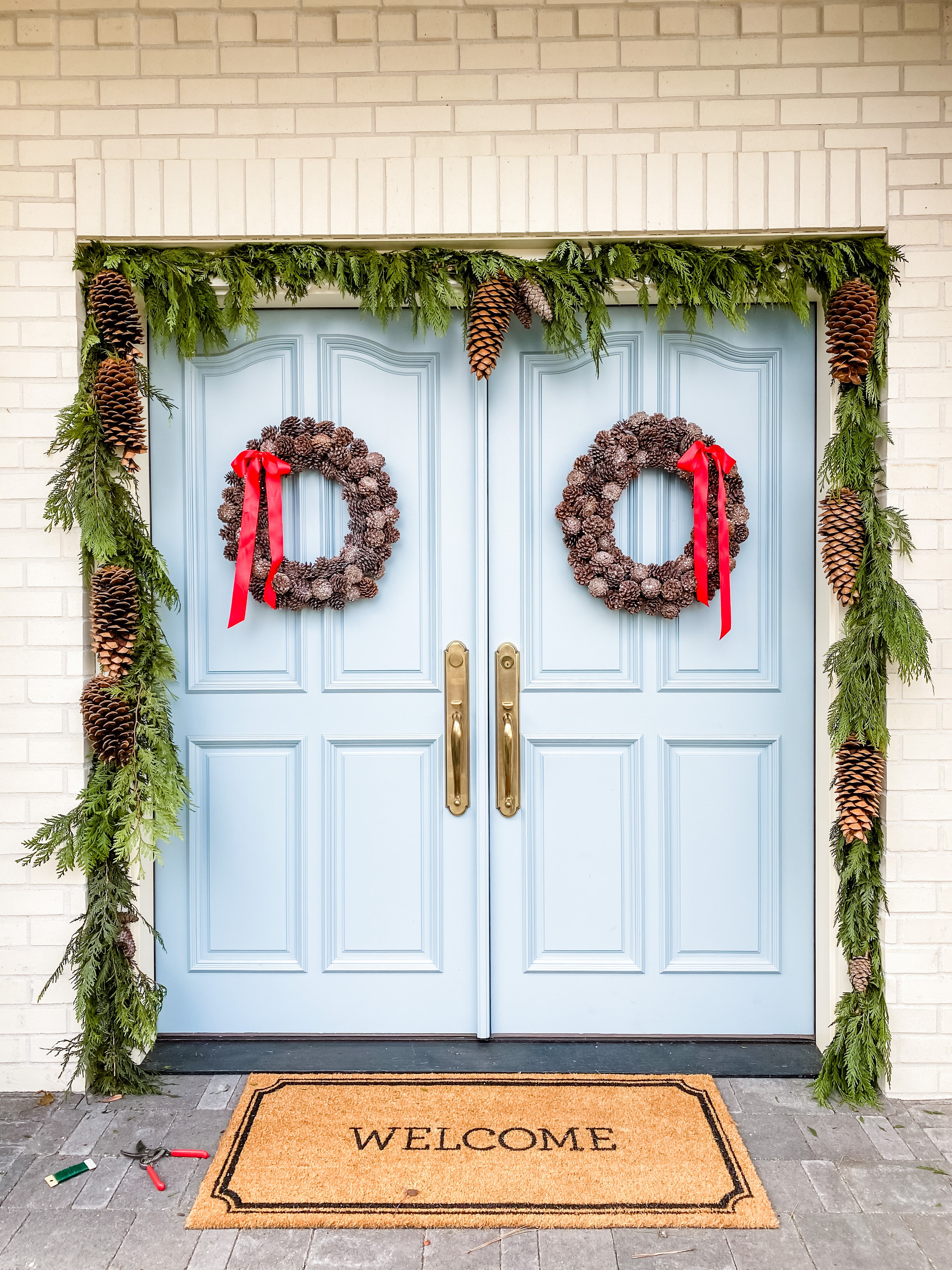 I love the tradition of placing a garland around the front door and I’ve discovered that I can make it much fuller by adding more elements to the garland once it’s hung. I’ll show you how!